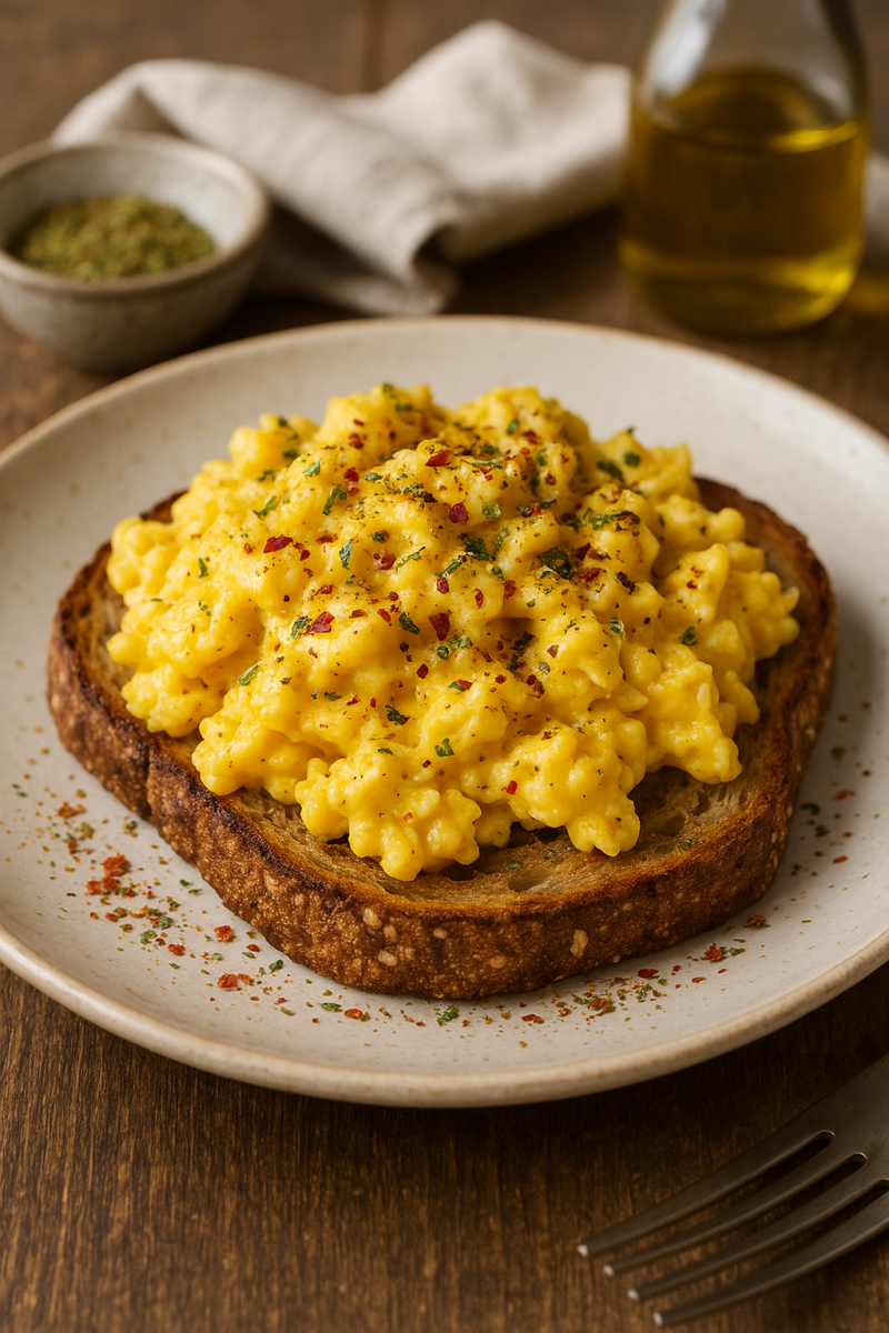 4. Quand les œufs sont encore légèrement crémeux, ajouter 1 c. à café de mélange rustique.